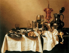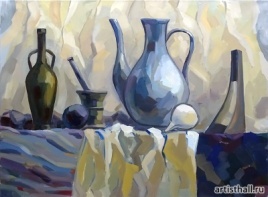 Натюрморт должен иметь композиционный центр - предмет либо самый крупный, либо самый яркий, либо наиболее выразительный в соответствии с задуманной темой. Предметы в натюрморте должны быть зрительно уравновешены, расположены так, чтобы возникло ощущение, что они водят хоровод вокруг главного предмета. Вместе все предметы вписываются в фигуру: треугольник, круг или квадрат. Композиционный центр совсем не обязательно совпадает с центром. Если рассматривать предметы слишком далеко друг от друга, в композицию может войти пустота; если слишком сблизить - натюрморт может получиться, наоборот, очень тяжелым, громоздким. Одинаковые предметы, расположенные по одной линии, создадут впечатление скучного однообразия. 3. В каком из натюрмортов выдержано равновесие? Для создания равновесия в композиции рекомендуется использовать чередование светлых и темных предметов, тяжелых и более изящных по форме, вертикальных и горизонтальных по своим основным пропорциям. Этим будет усиливаться выразительность натюрморта, предметы будут как бы помогать выявлять характерные качества друг друга. В постановке натюрморта предметы должны быть сгруппированы так, чтобы чувствовалась слаженность, уравновешенность, чтобы уже ничего не хотелось убрать, передвинуть или добавить. (2. Композиция) Возвращаемся к неправильному натюрморту, исправляем 4. Существенную роль в натюрморте играет фон. Взгляд зрителя имеет свойство стремиться вдаль. + облегченный передний план позволяет нашему глазу лучше воспринять предметы, размещенные в пространстве. Ненавязчивый задний план, он только дополняет, а не главенствует.