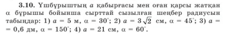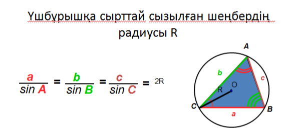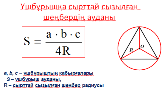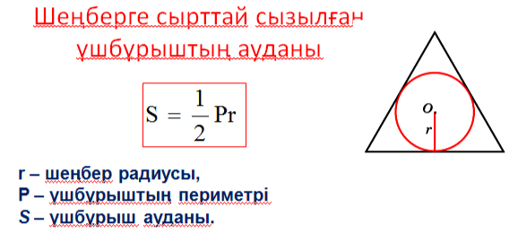 Үшбұрыштарға сырттай және іштей сызылған шеңберлердің радиустарын таба алу. Ол формулаларды шатаспай қай кезде қолданылатындығын есте сақтау. Қолданбалы есептерді шығара білу. |