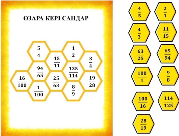 Сабақ мақсатымен танысады. Үй жұмысын айтады. Сұрақтарға жауап береді Үй жұмысы. Дескриптор: Білім алушы: -Кері санның анықтамасын қолданады; -Жай бөлшектерді бөлудің алгоритмін орындайды. Жалпы: 2 балл. |