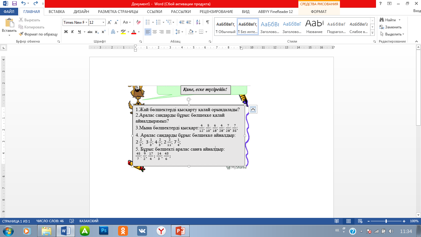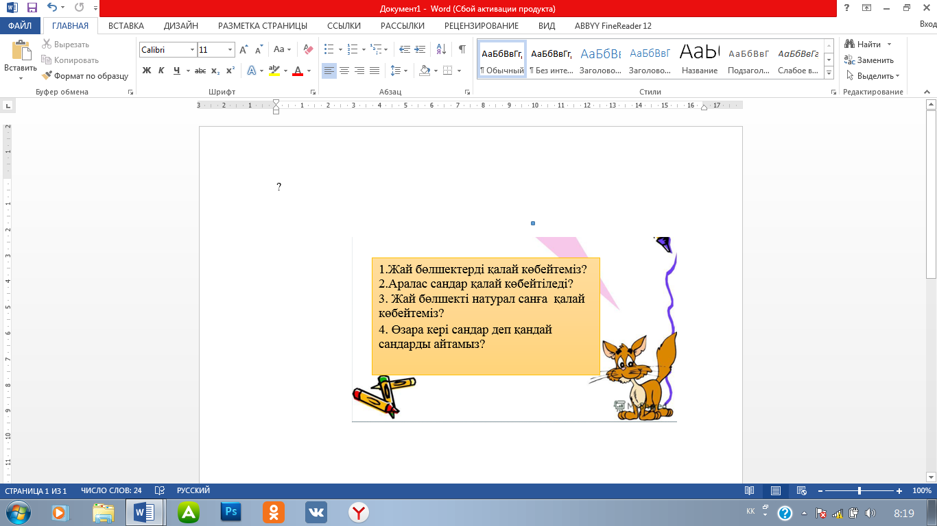 Слайдта жазылған барлық қайталау сұрақтары мен тапсырмалар интерактиті тақтамен беріліп, әр топ өз білгендерін, білетіндерін сыни тұрғыдан ойлау арқылы нақты дәлелдермен жауап береді «Бағдаршам» әдісі арқылы өзінің алдыңғы тақырыпты қалай меңгергенін бағалайды. «Идеялар себеті» Cабақтың басында әр топтағы оқушыларға түсіндіру.Оқушылар себетке әр тапсырмадан кейін топ ішінде жаңа бір тапсырма құрып,аты-жөнін жазып салып отырады. I.Жаңа тақырыпты түсіндіру. 5-сыныпқа арналған электронды оқулықтан «Жай бөлшектерді және аралас сандарды көбейту.Өзара кері сандар» көрсетіледі, мұғалім қысқаша шолу жасайды.Оқушылар зейін қойып тыңдайды Бүгінгі сабақтың мақсаты мен міндеттеріне тоқталады.Оқушыларға айтқызу. Сабақтың тақырыбын, мақсатын ашу үшін төмендегі тапсырмаларды беремін