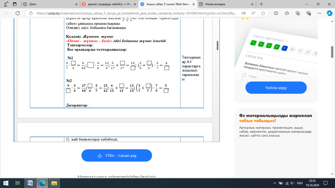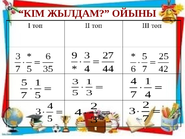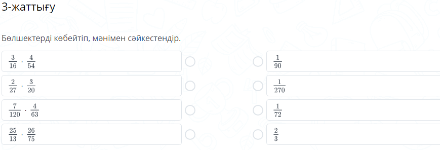 Берілген тапсырмаларды орындайды. Бөлшектерді көбейтіп, мәнімен сәйкестендіреді. |