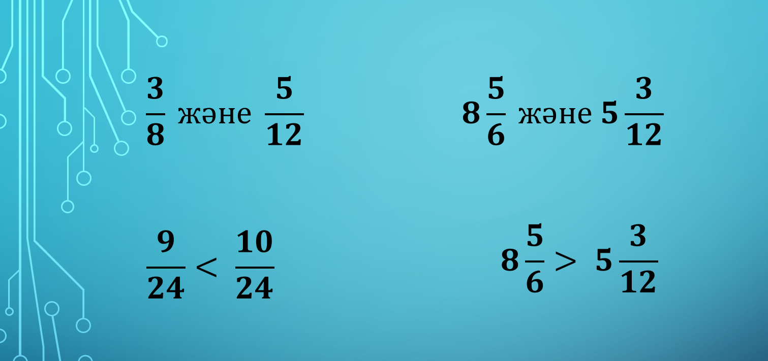 5.1.2.16 жай бөлшектерді ортақ бөлімге келтіру; жай бөлшектерді, аралас сандарды салыстыру; |
