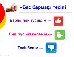 Әр топ бір-бірін «Бас бармақ» стратегиясымен бағалайды. Дескриптор: - Бөлімдері әр түрлі бөлшектерді қосу үшін: 1) бөлшектерді ең кіші ортақ бөлімге келтіреді; 2) бөлімдері бірдей бөлшектерді қосады |