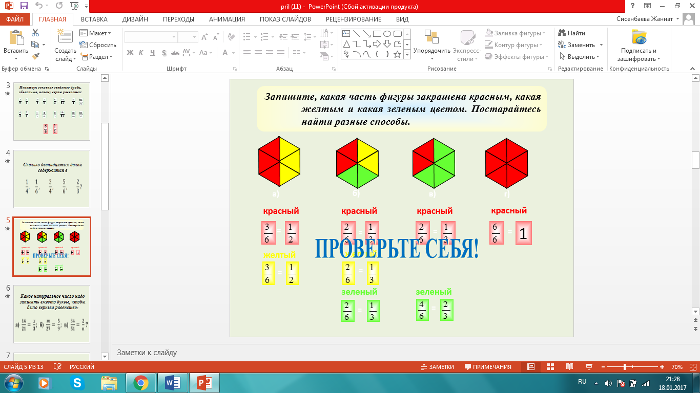- Қандай бөлшектер пайда болды? (Тең) - Бұл бөлшектердің арасына теңдік белгісін қоюға бола ма? (Ия.)