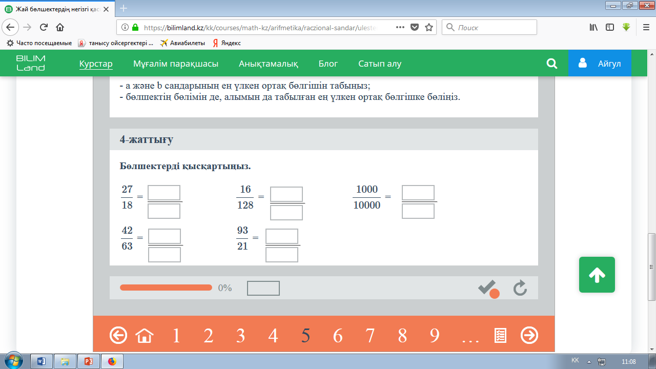 5.1.2.14 жай бөлшектерді қысқартуда бөлшектің негізгі қасиетін қолдану; 5.1.2.15 жай бөлшектерді жаңа бөлімге келтіру. |