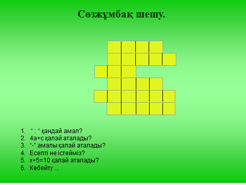Үйге тапсырма беру: әр топ 5 есептен шығару Сабақ аяқталды. Сау болыңыздар |