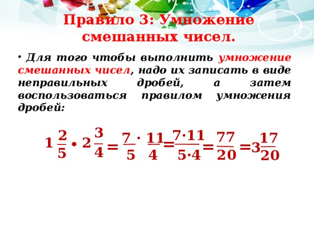 Аралас сандарды көбейту үшін: 1) оларды бұрыс бөлшек түрінде жазу керек; 2) бөлшектерді көбейту ережесін қолдану керек