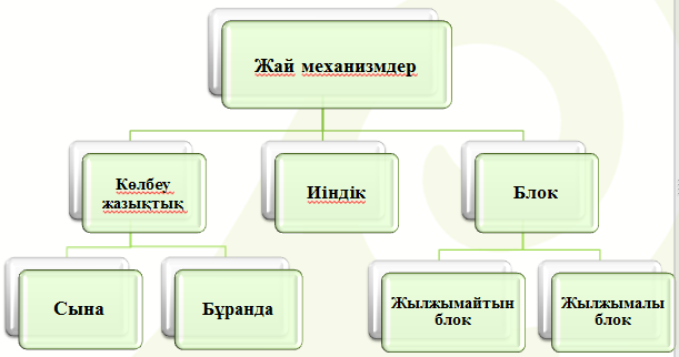 (I) Оқушыларға жай механизмдердің тұрмыстағы қолданылуына 8 мысал келтіріп, оның түрлерін анықтауын ұсыну. Оқушылар тақтадағы дайын жауаптар бойынша өзін – өзі тексереді. Бағалау критерийлері: