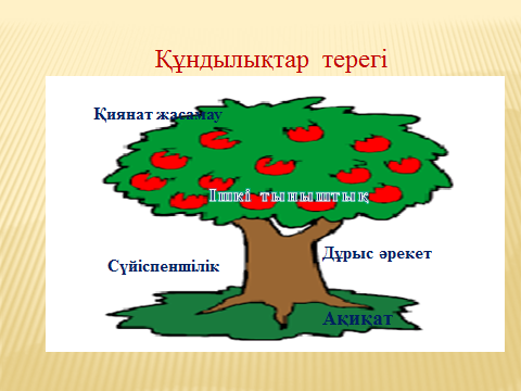 2.«Өзін-өзі тану» рухани-адамгершілік білім беру бағдарламасының аксиологиялық негіздері. Мәңгілік жалпыадамзаттық құндылықтар. (ақиқат, сүйіспеншілік, дұрыс әрекет, ішкі тыныштық, қиянат жасамау) 1.Абсолюттік яғни өзгермейтін жалпыадамзаттық құндылықтар. Құндылықтар Т.И Петракова бойынша 3-ке бөлінеді: табиғи, жүре пайда болған, абсолюттік құндылықтар. Жалпыадамзаттық құндылықтар. Ақиқат Сүйіспеншілік Дұрыс әрекет Ішкі тыныштық Қиянат жасамау Құндылық ағашы: адам ақиқатты танып, сүйіспеншілікпен дұрыс әрекет еткенде оның жан дүниесінде ішкі тыныштық пайда болады, ішкі тыныштығы бар адам ешкімге қиянат жасамайды.