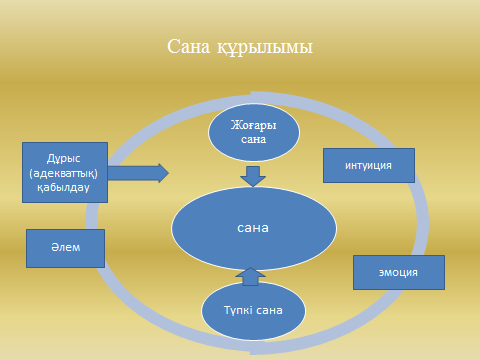 Білім беру, ойлау және түсіну үдерісі-олардың бәрі сананың ішінде болады.Санаға бес сезім мүшесі басты әсер етеді: оның ішіндегі екеуі –көру мен есту ақпарат алудың маңызды жолдары болып табылады және білім беру үдерісінің маңызды бөлігін құрайды. Сыртқы әлемнен алынған ақпарат бес сезім мүшесі арқылы түпкі санаға келіп түседі де, онда психоэмоционалдық реңге ие болады. Сондай-ақ түпкі санаға келіп түскен ақпаратты біз қалай қорытамыз, солай біздің эмоциялық күйіміз байқалады. Эмоциямыз жақсы күйде ол жоғары санада, интуициямыз жақсы жұмыс істейді. Рухани деңгейге жетеді. «Өзін рухани өмірге арнаған адам үшін ең қиыны- САНАны жоғары деңгейінде қол жеткізу ғана емес, оны ұстана білу». Омраам Микаэль. Айванхов (1900-1986) Демек, біз үнемі санамызды тазарту үшін жақсы ойлар ойлап қана емес, соны іс жүзінде қолдана білуіміз қажет екен. Сананы тазартуымыз керек. Стакан туралы айту. Сөз маржандарын оқу.