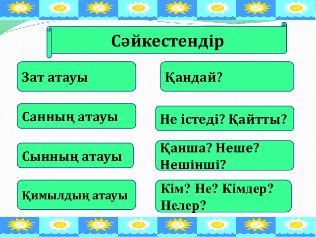 3.2.4.1 өз бетінше мәтіннің тақырыбын және мұғалімнің көмегімен негізгі ойды анықтау; 3.3.5.1 жіберілген пунктуациялық, орфографиялық, грамматикалық және стилистикалық қателерді мұғалімнің көмегімен тауып, түзету; 3.4.2.3 сөйлемнен сөз таптарын (зат есім, сын есім, сан есім, етістік)табу |