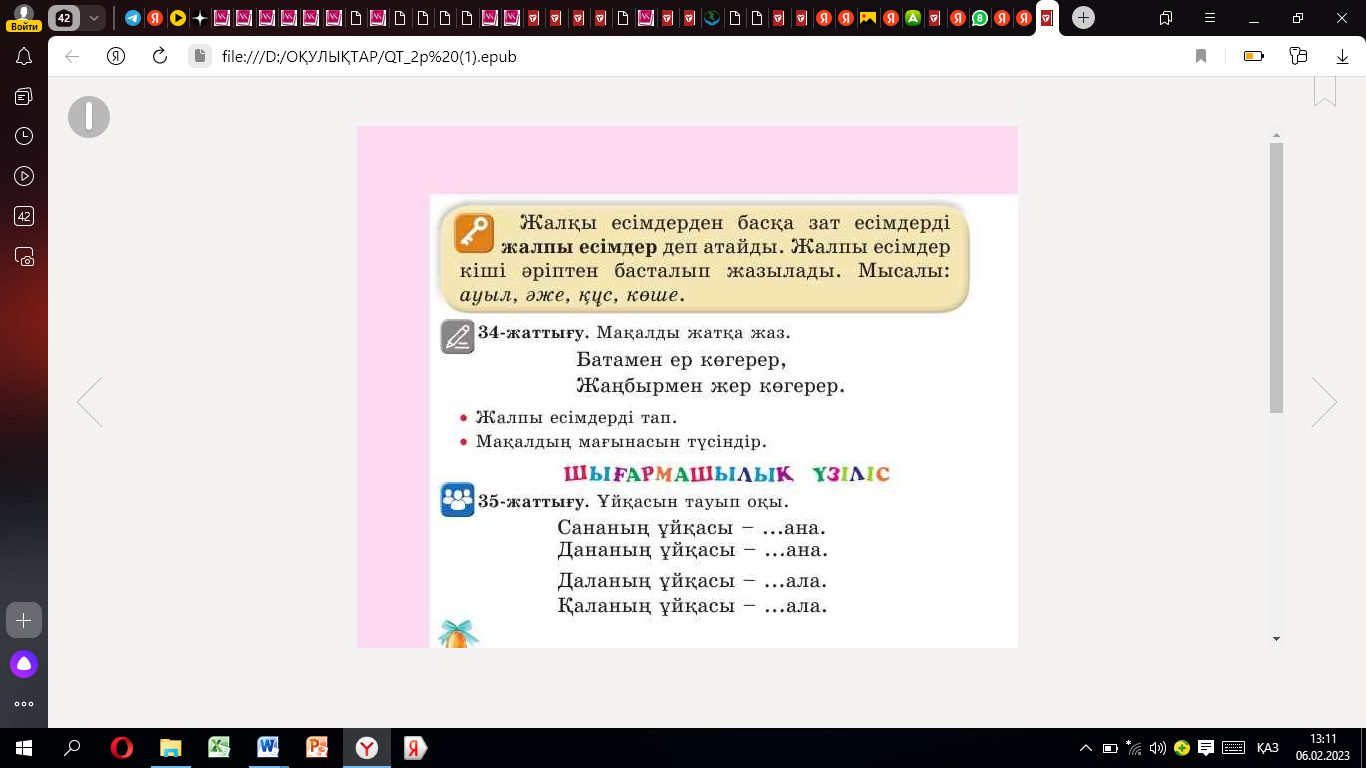 2.4.2.4 зат есімнің жалпы және жалқы түрлерін ажырату, жалқы есімнің жазылу емлесін сақтау; 2.1.1.1 - тыңдаған материал бойынша түсінбеген сөздерін белгілеу, мәтін мазмұны бойынша қойылған сұрақтарға жауап беру |