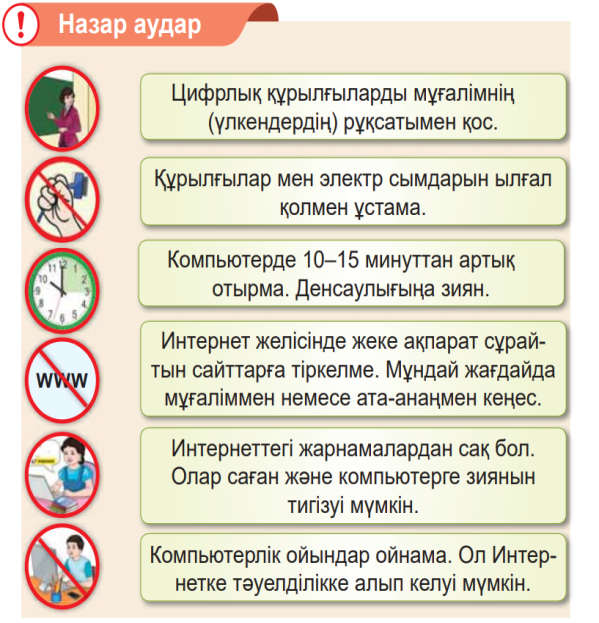 2.1.3.1 цифрлық құрылғылар және Интернет желілерімен жұмыс істеу кезінде негізгі қауіпсіздік ережелеріне сүйену; 2.3.1.1 берілген тақырып бойынша ақпарат іздеу үшін браузерді қолдану; |