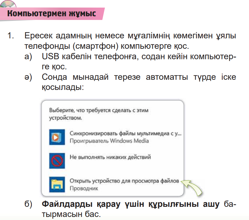 Дескриптор: - Ересек адамның немесе мұғалімнің көмегімен смартфонды USB кабель арқылы компьютерге қосады; -Экранда шыққан терезеден «Құрылғыны ашу» (Открыть устройство для просмотра файлов) батырмасын басады; -Ішкі жадты («Внутренняя память») табады және ашады; -«DCIM» бумасын тауып, ішін ашады; -Қажетті суретті таңдайды және компьютерге көшіреді. Сергіту сәті Оқушылар видеодан көрген- іс әрекетін қайталап сергіту сәтін жасайды