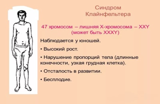Клайнфелтер синдромы- тек ер адамдар ауырады, аяқ –қолы ұзын, ақыл есі кем