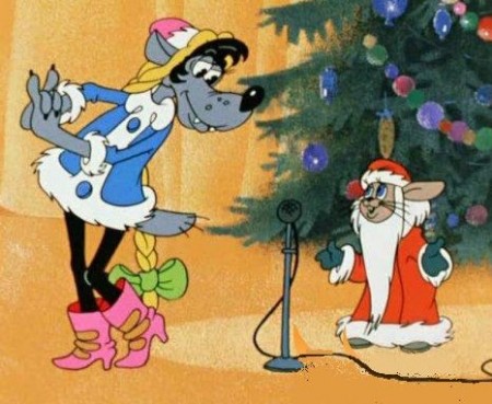 Ортада шырша. Қабырғаларда мультфильмдерден үзінді кадрлар бейнеленген. Әр кадрдың қасында кейіпкерлер қатып қалған күйінде тұрады.