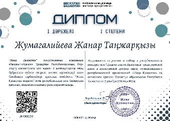 1)Диплом Жумагалиева Жанар Тангжаровна "Жаңа Қазақстан" республикалық ұйымының ұйымдастыру Қазақстан Республикасының Оқу-ағарту министрлігінің 2011 жылығы 7 желтоқсандағы №514 бұйырғына сүйене отырып, мектеп мұғалімдері және балабақша тәрбиешілері арасында өткізілген "Жаңа Қазақстан" атты республикалық эссе байқауына қатысып, жеңілпаз аталғаны үшін марапатталады 2) Құрмет Грамотасы Тәуелсіз Қазақстанның білім беру жүйесін дамытуға және білім беру сапасын арттыру мақсатында Республика деңгейінде “Ustaz tlegi” Республикалық ғылыми -әдістемелік журналының желілік басылымына өз авторлық жұмысын жариялағаны үшін Жумагалиева Жанар Тангжаровна марапатталады. 3) Сертификат Жумагалиева Жанар Тангжаровна “Ustaz tilegi “Республикалық ғылыми-әдістемелік журналының желілік басылымына оқу әдістемелік материал жарияланғанын растайды. |