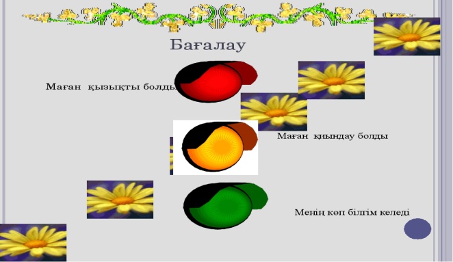 Қалыптастырушы бағалау арқылы сабақтың әр бөлімі бойынша бағаладым. «Шапалақ» «Бас бармақ» «Бағдаршам» әдісі арқылы