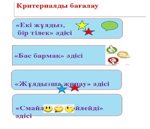 Дескрипторлар: -видеоматериялды тыңдауды және аударады; -сұрақтарға ауызша жауап береді. Кері байланыс - нені білді, нені үйренді; - не әлі де түсініксіз; - қандай бағытта жұмыс жүргізу қажет Рефлексия. Оқушылар таңдаған смайлик қағаздарға жазып береді.