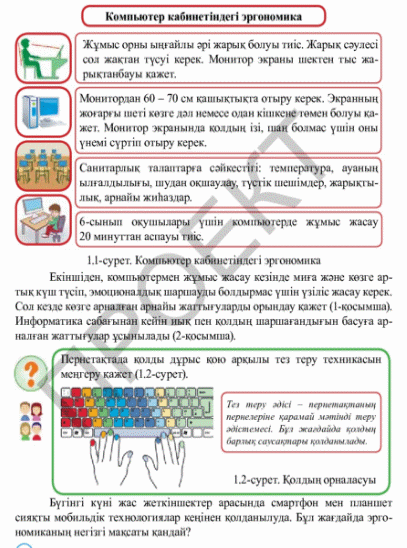 Жаңа сабақты түсіндіру Эргономика (гр. ergon – жұмыс + nomos – заң) – еңбек құралдары мен үдерістерін оңтайландыру арқылы еңбекке қолайлы жағдай жасау мақсатымен адамды (адамдар тобын) және оның қазіргі заманғы өндірістің еңбек үдерістеріне қатысуын зерделейтін ғылыми пән. “Адам – машина (техника‚ бұйым)”‚ “адам – орта” жүйелеріндегі байланыстарды оңтайлы шешу стратегиясын айқындайды.[1] Адам‚ машина және орта күрделі бүтін ретінде қаралуға тиіс екенін‚ мұнда адам жетекші рөл атқаратынын мойындайды. “Адам – машина – орта” кешенін ұтымды жоспарлап‚ енгізу үшін адам мен машинаның үйлесімділігін ескеретін эргономик. талаптарды қамтамасыз ету керек‚ олар: биофизикалық үйлесімділік – машина‚ басқару органдары және адам (оператор) талап етілетін күш-жігер‚ қуат‚ басқару әрекеттерінің жылдамдығы‚ дәлдігі‚ қарқыны тұрғысынан бір-біріне сай келуге тиіс; антрометрикалық үйлесімділік – адамның антропол. (бойы‚ жасы‚ салмағы‚ т.б.) және физиол. ерекшеліктерін ескере отырып, ұтымды ұйымдастырылған жұмыс орнын жасау; техникалық-эстетикалық үйлесімділік – машинаның тартымдылығын қамтамасыз ету. Эргономикалық талаптар адам мен техника арасындағы атқарымдарды бөлу мен келісуге‚ әрекет үдерістеріне (еңбектің сапасына‚ қауырттығына‚ т.б.)‚ әрекет құралдарына (жұмыс орнының жабдығына‚ басқару органдарына‚ т.б.)‚ әрекет жағдайына (микроахуалға‚ шуылға‚ дірілге‚ т.б.) жатады. Олар техниканы жасап‚ өндіріске енгізудің барлық сатыларында ескерілуге тиіс. Белгіленген талаптарға сай келетін эргономик. көрсеткіштер бұйымның жекелеген түрлерін пайдаланудың қолайлылығы мен қауіпсіздігін сипаттауға мүмкіндік береді‚ еңбектің мазмұнын байытып‚ тартымдылығын жақсартуға‚ өнімділігін арттыруға‚ адамның күш-қуатын‚ денсаулығын жұмыс істеу қабілетін сақтауға септігін тигізеді
