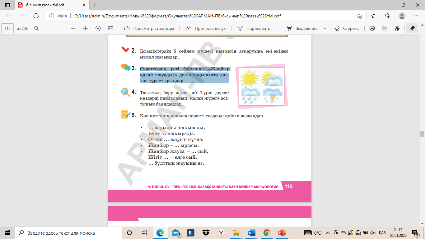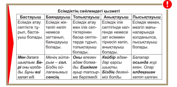2-тапсырма. Есімдіктердің 5 сөйлем мүшесі қызметін атқаруына екі-екіден мысал жазыңдар. Үлгі: Бастауыш: Мен бүгін кітапханаға бардым. Баяндауыш: Менің сүйікті кітабым осы. Толықтауыш : Асан сені ертең күтіп алады. Анықтауыш: Оның айтқаны әсер етті. Пысықтауыш: Ағасы әлдеқашан әскерге кетіп қалған. 5-тапсырма. Көп нүктенің орнына керекті сөздерді қойып жазыңдар. • ... дауылды шақырады, Бұлт ... шақырады. • Өткен ... жауын күтпе. • Жаңбыр – ... ырысы. • Жаңбыр жауса – ... сый, Жігіт ... – елге сый. • ... бұлт тың жауыны аз. • Басшысыз – ... жетім, Жауынсыз – ... жетім. • Сәуір болмай ... болмас,