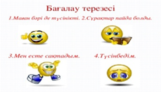 Дескриптор: Өз өлкесіндегі жануарлар тіршілігі туралы айта алады Жойылу алдындағы жануарлар туралы айта алады. Оларды сақтау туралы біледі. Дескриптор: Тест тапсырмаларын орындай алады Өтілген білім нәтижесін көрсете алады Бағалау кретерийлерін ұсыну «Жұлдыздар шеруі» әдісі |