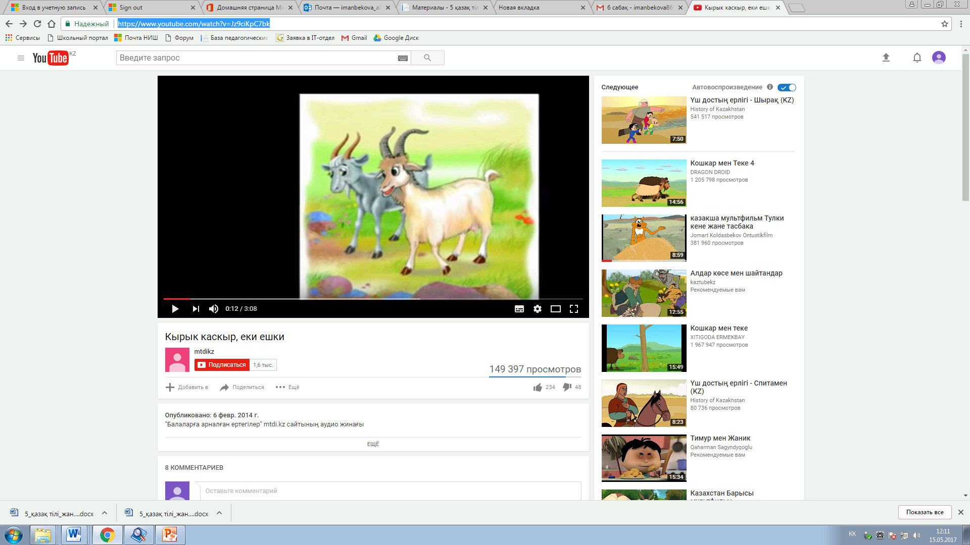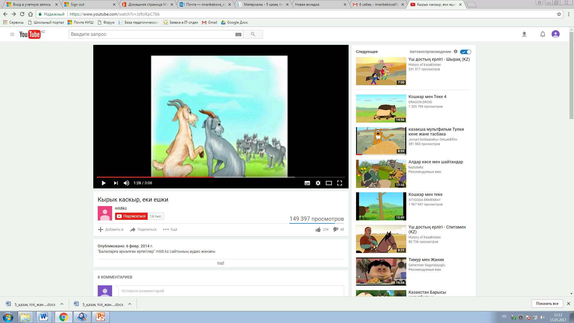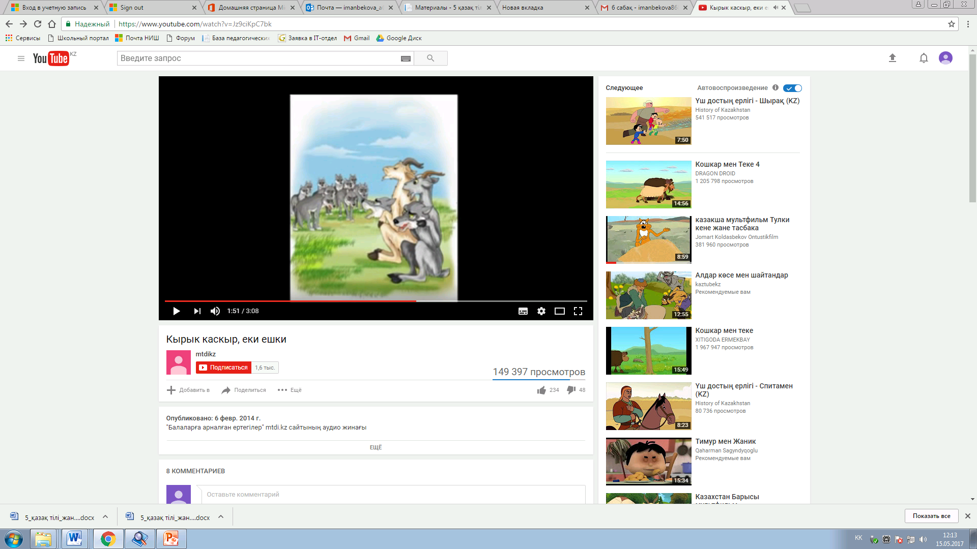 Тыңдалым тапсырмасы. https://www.youtube.com/watch?v=Jz9ciKpC7bk сайтынан «Қырық қасқыр, екі ешкі» ертегіні тыңдайды. Бейнежазбаны бөліктерге бөліп тыңдайды. Тыңдалған мәтін бөлімі бойынша жетекші сұрақтар беріледі: - Екі ешкі неге қашып кетпекші болады? - Екі ешкі неліктен райынан қайтады? - Екілер қасқырларды қалай алдап соғады? - Неге қасқырлар үрейлене түседі? - Қырық қасқыр неге екі ешкінің қонақ етеді? - Екі ешкі неге қасқырларды мазақ етеді? - Мұндай оқиға өмірде кездесуі мүмкін бе? - Екі ешкі мен қасқырлардың әрекетіне баға беріп көр. Берілген сұрақтар негізінде мәтіндегі негізгі ойды анықтайды. Сұрақтар бойынша қорытынды жасалады. Бағалау критерийіне сай бағалайды.