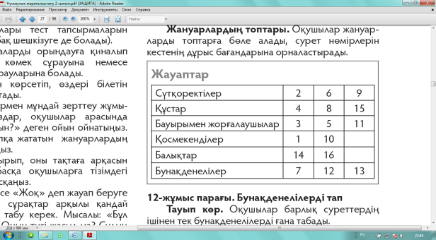2.2.2.2 – жануарлардың класының өкілдерін ажырату: сүтқоректілер, құстар, балықтар, қосмекенділер, бауырымен жорғалаушылар және бунақденелілер.