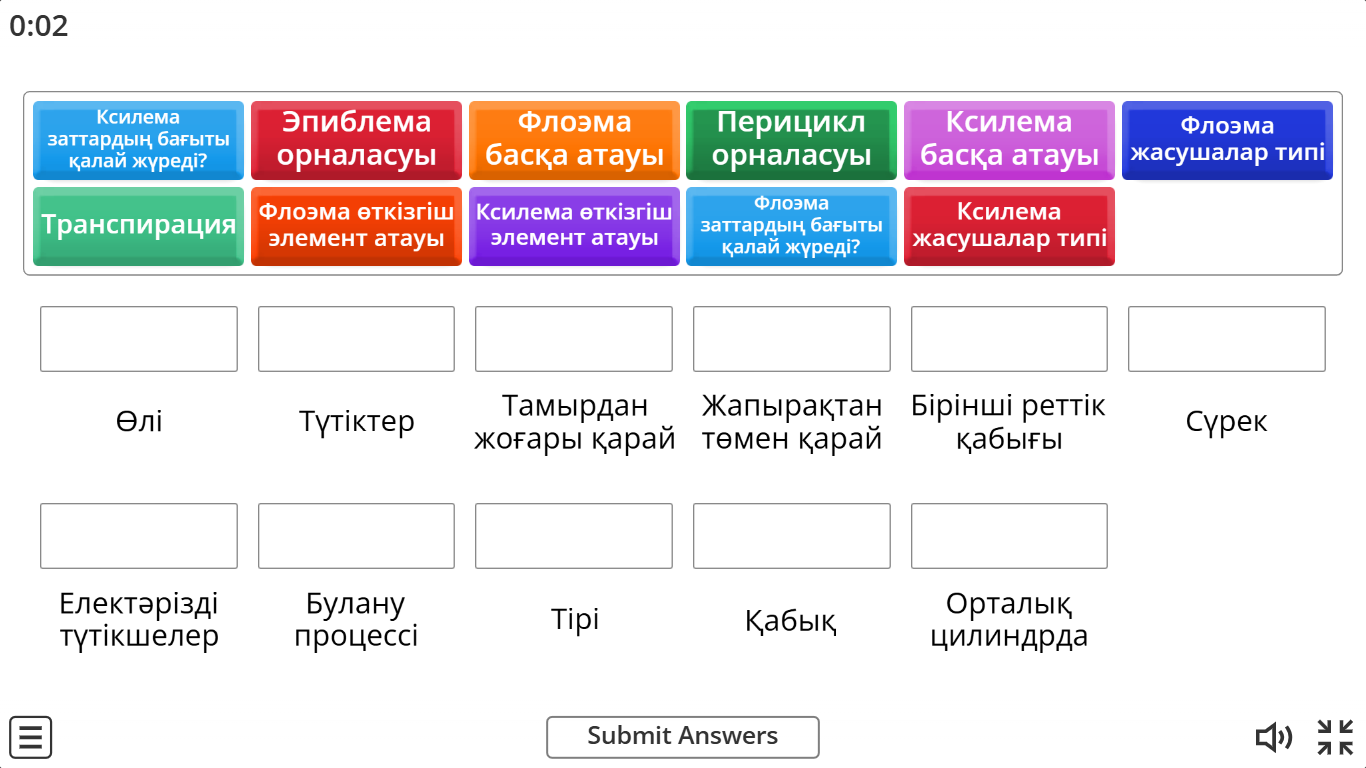 Өткен білімді еске түсіру. «Wordwall» әдісі. 1.Жоғары сатыдағы өсімдік ағзасындағы басты тасымалдаушы ұлпалар 2. Өсімдік ағзасында тасымалды жүзеге асырады: 3.Тамырдан жоғары қарай жылжу үшін қалыптасқан өткізгіш ұлпа: |