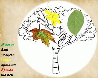 Тақырыпты қорытындылау.өмірмен байланысты.Неге жаз мезгілінде біз ағаштың түбінде көлеңкелейміз? Орманға барғанда сіздер нені сезінесіздер? Табыс критерийлері арқылы өздерін бағалайды.Стикер арқылы оқушылар жаңа сабақты қалай меңгергенін талдау жасайды Рефлексия. «Күзгі жапырақтар» Жасыл жапырақ – Бәрі жақсы,түсінікті болды, табысқа жеттім. Сары жапырақ – Сұрақтарым бар, толық табысқа жеткен жоқпын. Қызыл жапырақ – Қиналдым, табысқа жету үшін тағы қайталауым керек.
