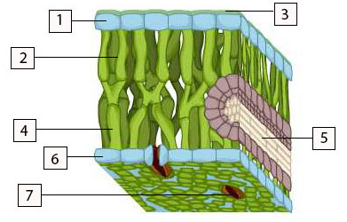 1-Тапсырма:Төменде жапырақтың ішкі құрылысы берілген. Жапырақтың 1, 2, 3, 4, 5, 6, 7 сандарымен берілген құрылымдарын атаңыз.