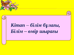 арналады. Мұғалім: Кітап білімімізді молайтады, кітаптан көп үлгі – өнеге мен тәрбие аламыз. Оқыған – тоқығаның көп болса, жеңбейтін жау алынбайтын қамал жоқ. Дана халқымыз: «Батыр бірді, білімді мыңды жығады»,- деп айтпаса керек. Кітап заманымыздың өмірі. Ол кәріге де, жасқа да қажет. Біз кітаппен күн сайын күн сайын кездесеміз. Кітап адамның дүниетанымын кеңейтіп, рухани дүниелерді оятып, ертегі, әңгімелермен сыр шертіскен - кітап ең жақын ақылшымыз.