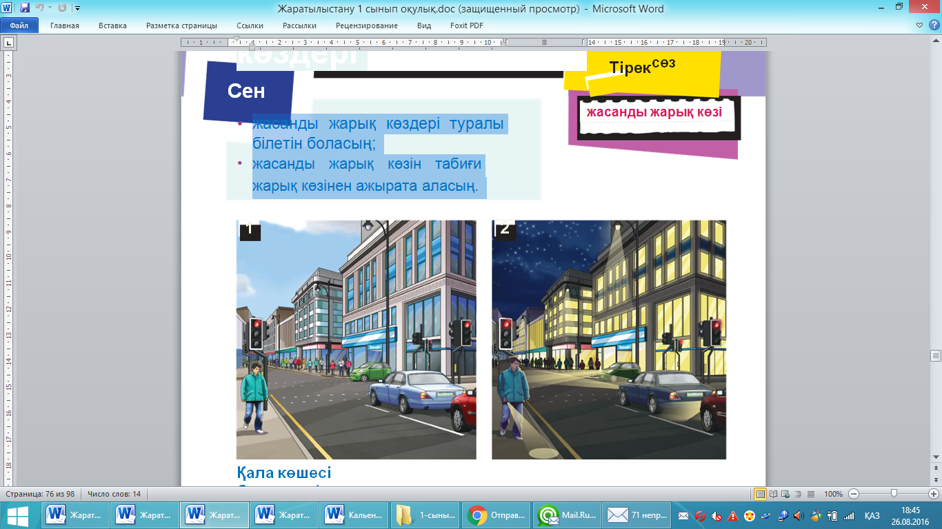 Жасанды жарық көздері. Оқулықтағы суретке қарауды ұсыныңыз. Оқушылар күнделікті қолданып жүрген жарық көздерін еске түсіріп, сұрақтарға жауап береді. Жарық көздерінің қайсысын жиі кездестіресің? Бұл жарық көздерін қайдан көруге болады? Оқушылар күнделікті қандай жарық көздерін қолданады? Топ ішінде тізім құруды ұсыныңыз. Оқушылардың жауабы ұпайларын арттыруға көмектеседі. Түнде жұмыс істейтін адамдар қандай жарық көзін пайдаланатынын айтыңыз, мысалы, наубайханада, зауытта және фабрикада. Оқушылардан қандай маман иелері түнде жұмыс істейтінін сұраңыз. Біреуі нің ата-анасы түнгі уақытта жұмыс істесе, жұмыс ту ралы егжей-тегжейлі біліп, сыныпқа айтуды ұсыныңыз. Жасанды жарық көзі не үшін қажет? Оқушы ларға тапсырманың сұрақтарына жауап беруді ұсыныңыз. Талқылау барысында оқушылар кейбір жарық көздерін қолдану арқылы біреудің өмірін сақтап қалуға болатынын түсінеді. Оқушыларды саяхат жасауға шақырыңыз. “Дауыл күшейіп келеді. Экипаждың өмірін сақтап қалу үшін тез арада дұрыс шешім қабылдау қажет”. Суретке қарап, жарық көздерінің қаншалықты маңызды екенін сұраңыз. Шамшырақ пен белгі беретін құралға ерекше көңіл аудару керек. Адам өмірін сақтап қалу үшін жарық көзінің қаншалықты маңызы бар? Жауабы Шамшырақ. Кемелер жартастарға соғылмау немесе суасты үңгірлеріне түсіп кетпеу үшін және жағалаудың қауіпті аумағын жарықтандырy үшін қажет. Үлкен аспашам. Бөлмені жарықтандыру үшін керек. Көше шамдары. Түнгі уақытта көшені жарық тандыру үшін қажет. Белгі беретін құрал. Белгілі бір арақашықтықта белгі беру үшін керек. “Теңізшілер шамшырақтың (маяк) жарығын көрді”. “Шамшырақ” атты жаттығуды орындауды ұсыныңыз (орындарынан тұрып орындайды). “Көздеріңді жұмыңдар. Терең тыныс алыңдар. Теңіздің ортасында жартасты жағалау бар деп елестетіңдер. Аралдың ең биік нүктесінде шамшырақ тұр. Әркім өзін адамдарға көмектесетін шамшырақпын деп есептесін. Аралда күшті жел тұрғанда сен қозғалмайсың. Күн демей, түн демей сен мұнара басынан жарық сәулесін шашып тұрасың. Саған адамдар сенеді, көмекке дайын тұратыныңды бағалайды, көздеріңді ашыңдар”. Сұраңыз: “Шамшырақтың орнында өзіңді қалай сезіндің? Теңізшілерге жол көрсетy сендерге ұнай ма? Сендерге қандай жағдайда сенім артуға болады?” Ойлан! Оқушылардан далада жанған алауды көргені болса, еске түсіріп, от жалынының күшеюін қимылмен көрсетуді ұсыныңыз. Алаудың қандай жарық көзіне жататынын сұраңыз. Жауабы Алау — жасанды жарық көзі. Алау отының жалыны жасанды жарық көзіне жатады. Тілдік құзыреттілікті қалыптастыру