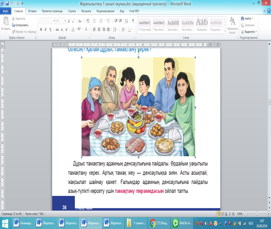 Пайдалы тағам. Тамақтану пирамидасын көрсетемін немесе кітаптағы суретке назар аударту. Суретте көрсетілген барлық топтарды және жеке азық-түліктерді атап шығады. Олардың қайсыларын көп және жиі қабылдау керектігін ой лануларын ұсынамын. (Дәнді дақылдар, макарон өнімдері, ботқалар.) Олар пирамиданың қай жерінде орналасқан? Жоғарыда не орналасқан? (Май.) Оны жеуге бола ма? (Иә, бірақ көп мөлшерде емес.) Оқушылар пирамидада “күнделікті тағамға пайдалануға қажет азық-түлік топтары көрсетілген” деген қорытындыға келулері тиіс. Пирамиданың төбесіне жақын орналасқан азық-түліктерді аз мөл шерде пайдалану керек. Шеңбердегі азық-түлік. Оқушылар неліктен шеңбердің ішінде бейнеленген азық-түліктерді көп мөлшерде қолдануға тыйым салынғандығы туралы ойланады. Барлық нұсқаларды тыңдап шығамын. Газдалған тәтті сусындармен шөлді басуға болмайтынын, себебі олардың құрамында көп мөл шерде қант болатынын айтамын. Тез дайындалатын азық-түліктердің де зиянды екенін айтып өтемін. Олар туралы сабаққа арналған арнайы материалдарды қолдана отырып айтып беремін. Кері байланыс: Суреттегі барлық тағам түрлерін ата. Сен олар туралы не білесің? Қалай дұрыс тамақтану керек? Оқушылар пирамидада “күнделікті тағамға пайдалануға қажет азық-түлік топтары көрсетілген” деген қорытындыға келулері тиіс. Жеке жұмыс. ҚБ тапсырмасы. Бағалау критерийі: Білім алушы Адамның өсіп-дамуына қажетті жағдайларды атайды. Адамның өсіп-дамуы үшін орындалатын әрекеттерді анықтайды. 1-тапсырма Адамға пайдалы тағамдардың тұсына