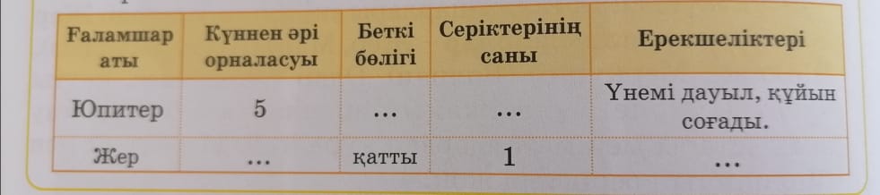 1.Аспан әлемі не деп аталады? 2.Жердің табиғи серігі қалай аталады? 3.Айдың бетіндегі дөңгелек шұңқырды не деп атаймыз? 4.Күн жүйесіндегі 6 планета қалай аталады? 5.Күн жүйесіндегі 5 планета қалай аталады? 6.Сұлулық құдайы деп аталған қай планета? 7.Аспан денелерінің жүретін жолы не деп аталады? 8.Ғарышқа ұшатын адамды кім дейміз? -Жарайсыңдар! Зымыранның бір жұлдызын бояймыз. Жаңа тақырып -Балалар бізде жаңа сөзжұмбақта қандай сөз шықты? -Демек бүгінгі біздің тақырып «Ғаламшарлар қандай болады?» деп аталады. Бүгін біз қай ғаламшарларды алып деп атайтынын білеміз. 1-тапсырма Ұжымдық жұмыс -Кітаптағы ғарыш кемесінің траекториясын бақылайықшы. Қандай сөз шықты? -Демек Юпитер ғаламшарын тағы қалай атайды екенбіз? -Енді жер тобындағы және алып ғаламшарлар туралы видео көріп алайық. 2-тапсырма Жеке жұмыс Ақпаратты талдап белгіле: