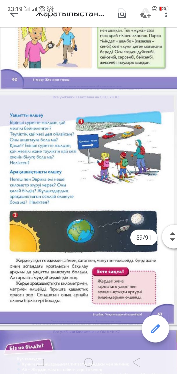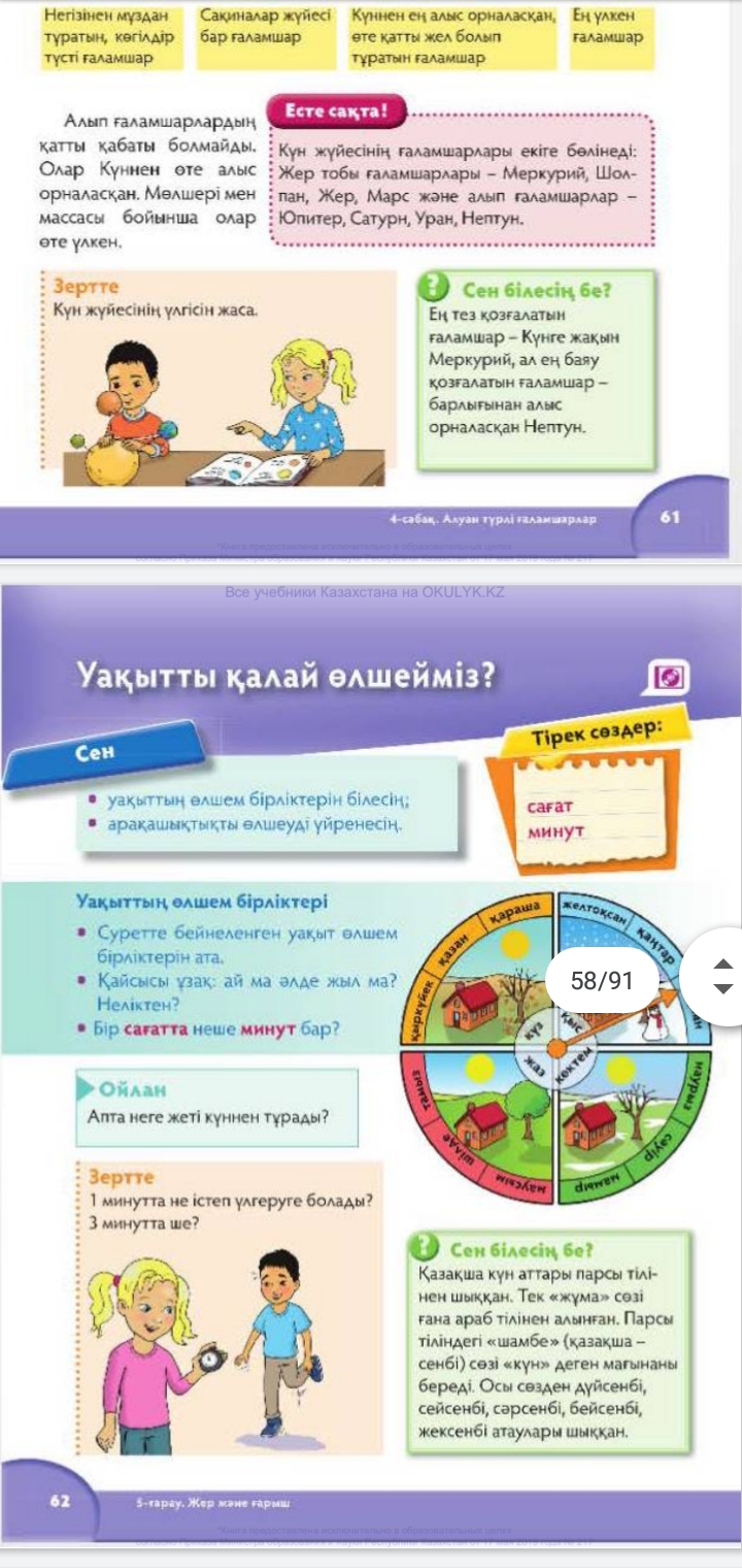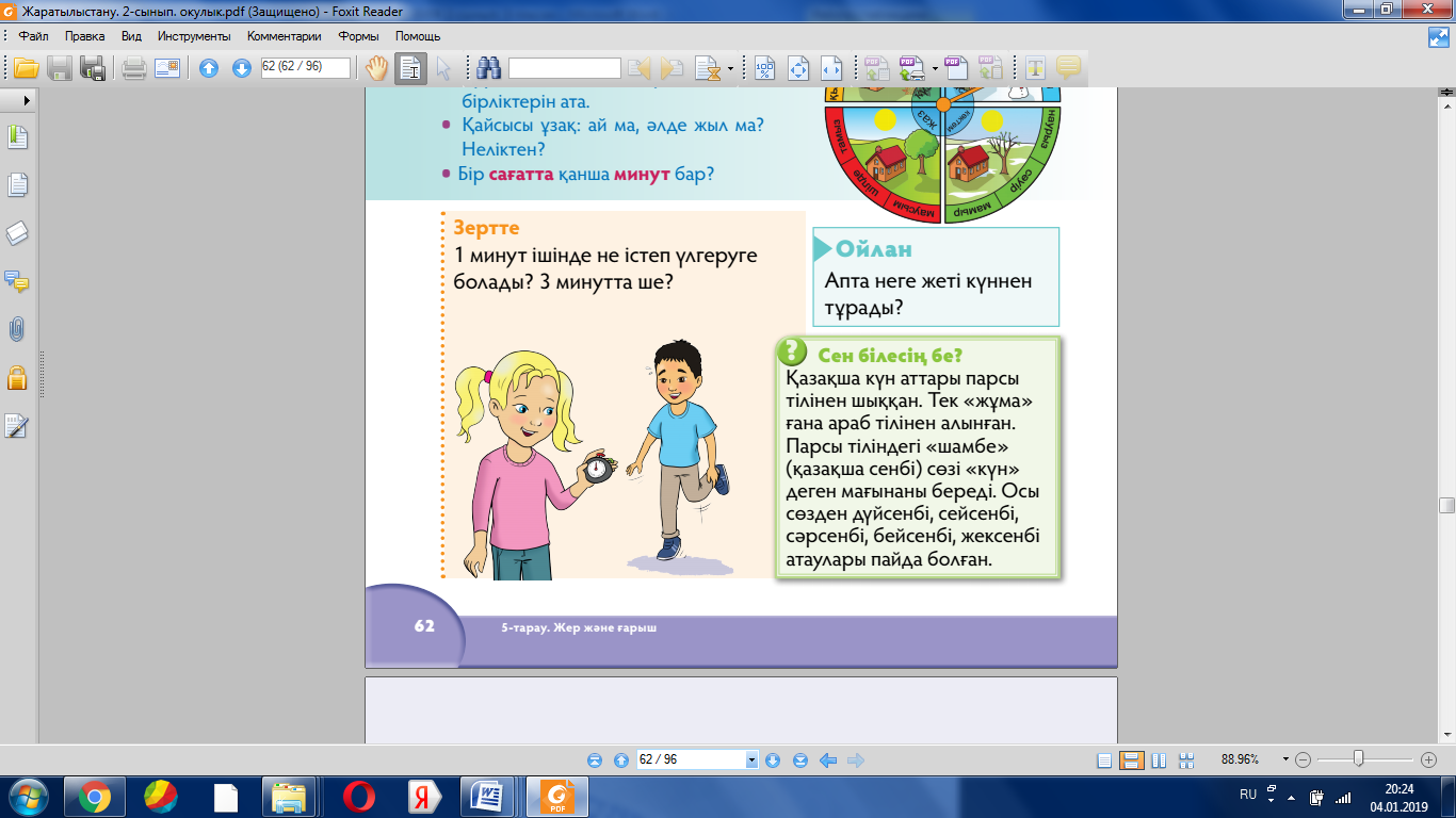 болатынын зерттейді; 4. Бірін-бірі толықтырады; Дескриптор: Ойлан апта неге жеті күннен тұрады? Дескриптор: Оқулықтағы тапсырманы оқиды. Уақыт өлшеу мағынасын түсіндіреді. Суреттен қарап ой түйіндейді. |