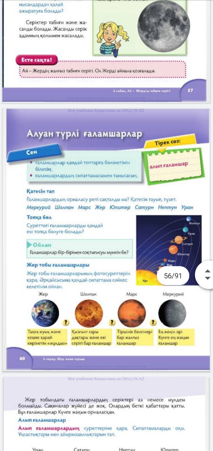 Барлық 400 000 материалдарды шексіз жүктеу мүмкіндігіне ие боласыз 1 990 ₸ 49 000₸ 1 айға қосылу Материалға шағымдану Бұл материал сайт қолданушысы жариялаған. Материалдың ішінде жазылған барлық ақпаратқа жауапкершілікті жариялаған қолданушы жауап береді. Ұстаз тілегі тек ақпаратты таратуға қолдау көрсетеді. Егер материал сіздің авторлық құқығыңызды бұзған болса немесе басқа да себептермен сайттан өшіру керек деп ойласаңыз осында жазыңыз Жариялаған: Төлегенова Жұлдыз ШәмілқызыШағым жылдам қаралу үшін барынша толық ақпарат жіберіңіз Жаратылыстану 2 сынып ІІІ – тоқсан Тақырыбы : Алуан түрлі ғаламшарлар