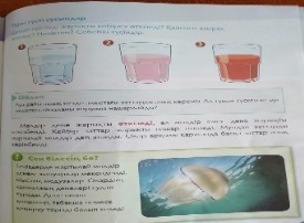 Сыныптағы мөлдір заттарды тап. Оларды қалай анықтадың? Керамикадан жасалған стақанға қол шамды пайдалана отырып, жарық өткізгіштік қасиетін анықта? 2- тапсырма «Ашық сұрақ» әдісі Интерактивті тақтамен де көрсету) Оқушылардың назарын суретке аударып, сұрау: -Қандай ертінді жарықты көбірек өткізеді? -Қайсысы азырақ өткізеді? -Себебін түсіндір? «Венн диаграмма» әдісіне салады.