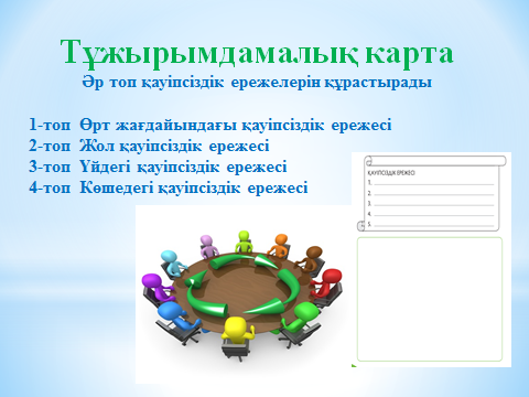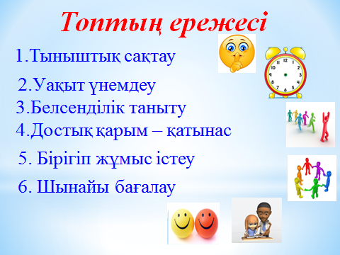 Слайд Қағаздарда бейнеленген суреттер бойынша топқа бөлініп отырады. Ламинатталған бетке жазылған топ ережесі. |