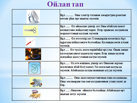 Бұл......... Ол өте өткір зат. Үлкендердің көмегінсіз бұл құралды пайдалануға болмайды. Қолыңды кесіп алуың мүмкін. |