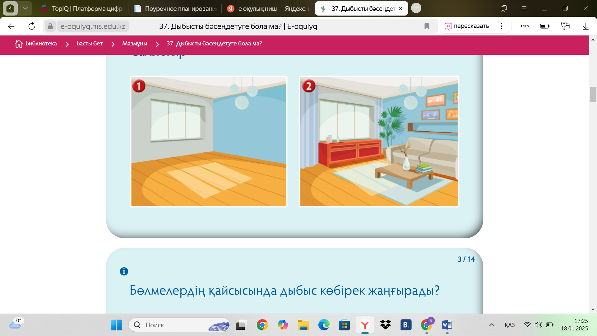 -Бөлмелердің қайсысында дыбыс көбірек жаңғырады? (1) -Қай бөлмеде дыбыс құлаққа жағымды естіледі? (2) -Дұрыс тұжырымды белгіле (Кілем, жұмсақ жиһаз терезе пердесі дыбысты жұтады) ЕБҚ тапсырмасы Сурет бойынша әңгімелейді. 3. Мәтінді оқы. -Мәтін не туралы? (дыбыстың жұтылу қасиеті және оны қолдану туралы)