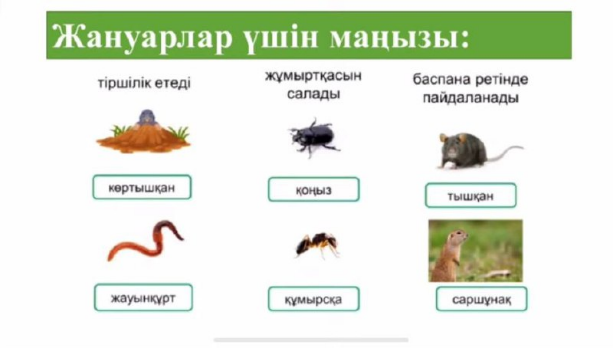 «Постер» әдісі арқылы жұмыс жасайды. 1-топ. Адам. Адам топырақты не үшін пайдаланады? 2-топ. Жануарлар. Жануарлар үшін топырақтың ролі қандай? 3-топ. Өсімдіктер. Өсімдіктер топырақтан не алады?