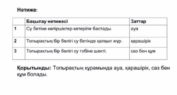Дескриптор: 1.Тәжірибеге қажетты заттарды алады-1ұ. 2.Тәжірибені жасайды-1ұ. 3.Бақылайды-1ұ. 4.Қорытынды жасайды-1ұ. |