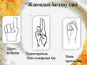 (Ұ). Ұйымдастыру кезеңі: 1. Оқушылармен амандасу, түгендеу. 2. Ынтымақтастық атмосферасын қалыптастыру Мақсаты: Оқушылар бір-біріне тілек білдіреді, тыңдау дағдыларын дамытуға бағытталады, сондай-ақ барлық оқушылардың қатыстырылуы арқылы сабаққа белсенділігі артады. Тиімділігі: Оқушылар бір-біріне тілек айту арқылы жақындасады, көңіл-күйін көтереді және бауырмалдығын оятады. Саралау: Бұл жерде саралаудың «Жіктеу» тәсілі көрінеді. Оқушылардың оқуға деген қызығушылығын арттыру мақсатында мүмкіндігінше оларға таңдау еркіндігі беріледі. |
