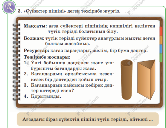 Сүйектер пішінін зерделеп, тәжірибе жүргізеді-1балл.