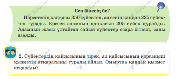 Дескриптор: Сөздікті жаттайды-1балл. Мәтінді оқып қаңқа сүйектерін атайды -2балл.