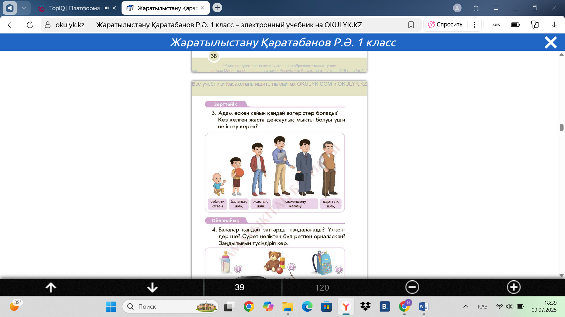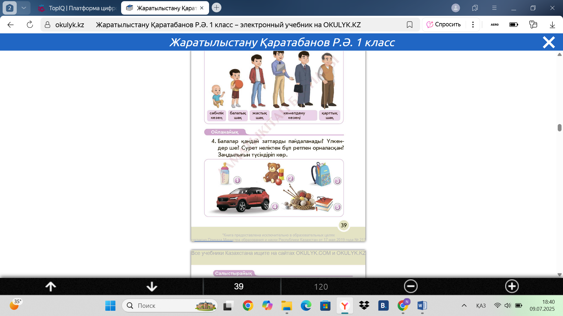 – Бала сәби шағында тез өседі. Жастық шақта өсіп-жетіледі. Кемеліне келген және қартайған шағында өсуі тоқтайды. Адам дүниеге келеді, өседі, өзгереді және дамиды. Сен туғанда нәресте болдың. Одан кейін балдырған болып өстің. Ал қазір сен оқушысың. Mектеп жасынан кейiн жасөспірімдік кезең басталады, одан кейін жастық, есейген және қартайған шақ келеді. ЕБҚ тапсырмасы Тобының көмегімен тапсырмаларды орындайды. 3. «Ойланайық» Балалар қандай заттарды пайдаланады? Үлкендер ше? Сурет неліктен бұл ретпен орналасқан? Заңдылығын түсіндіріп көр.