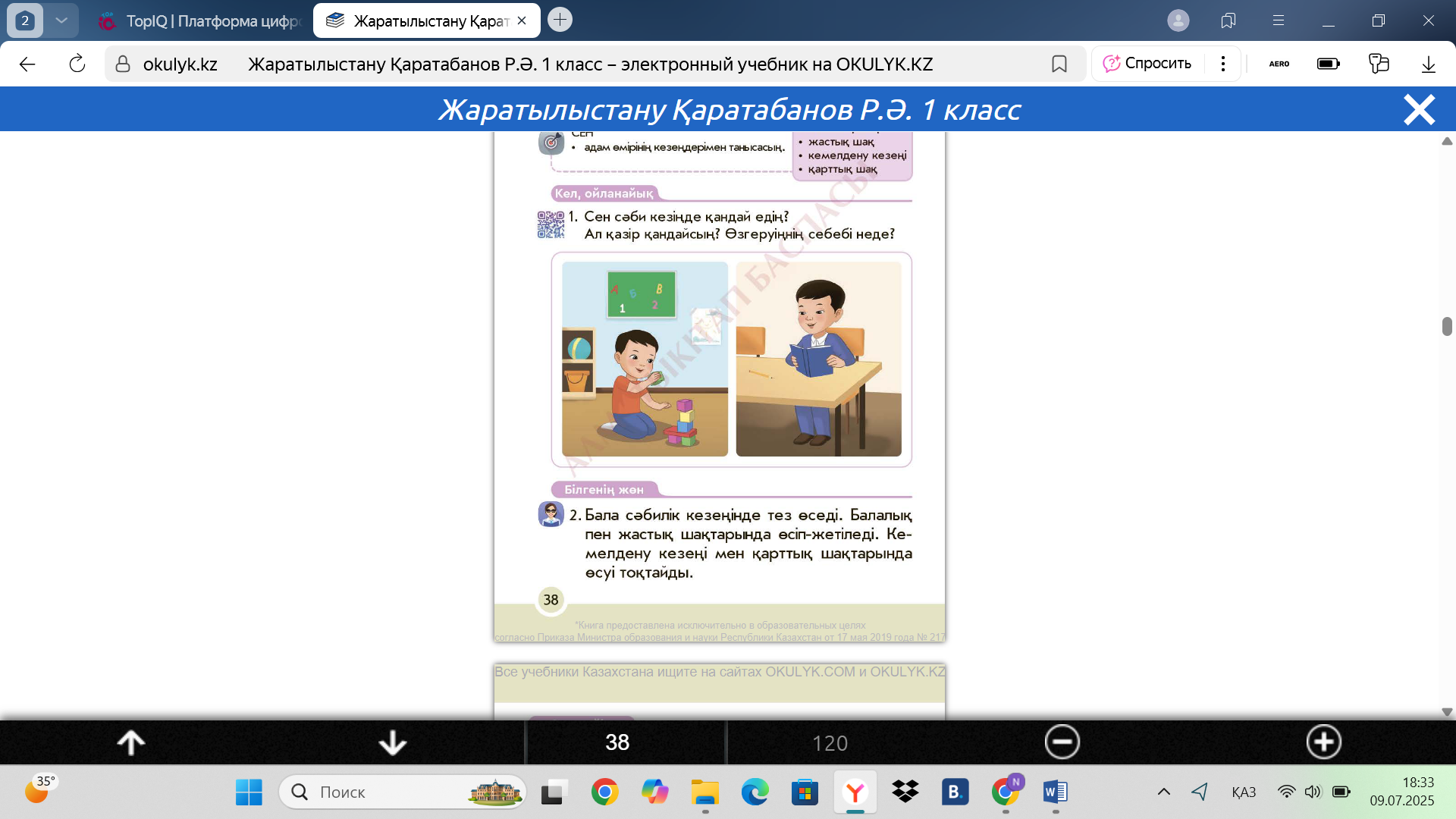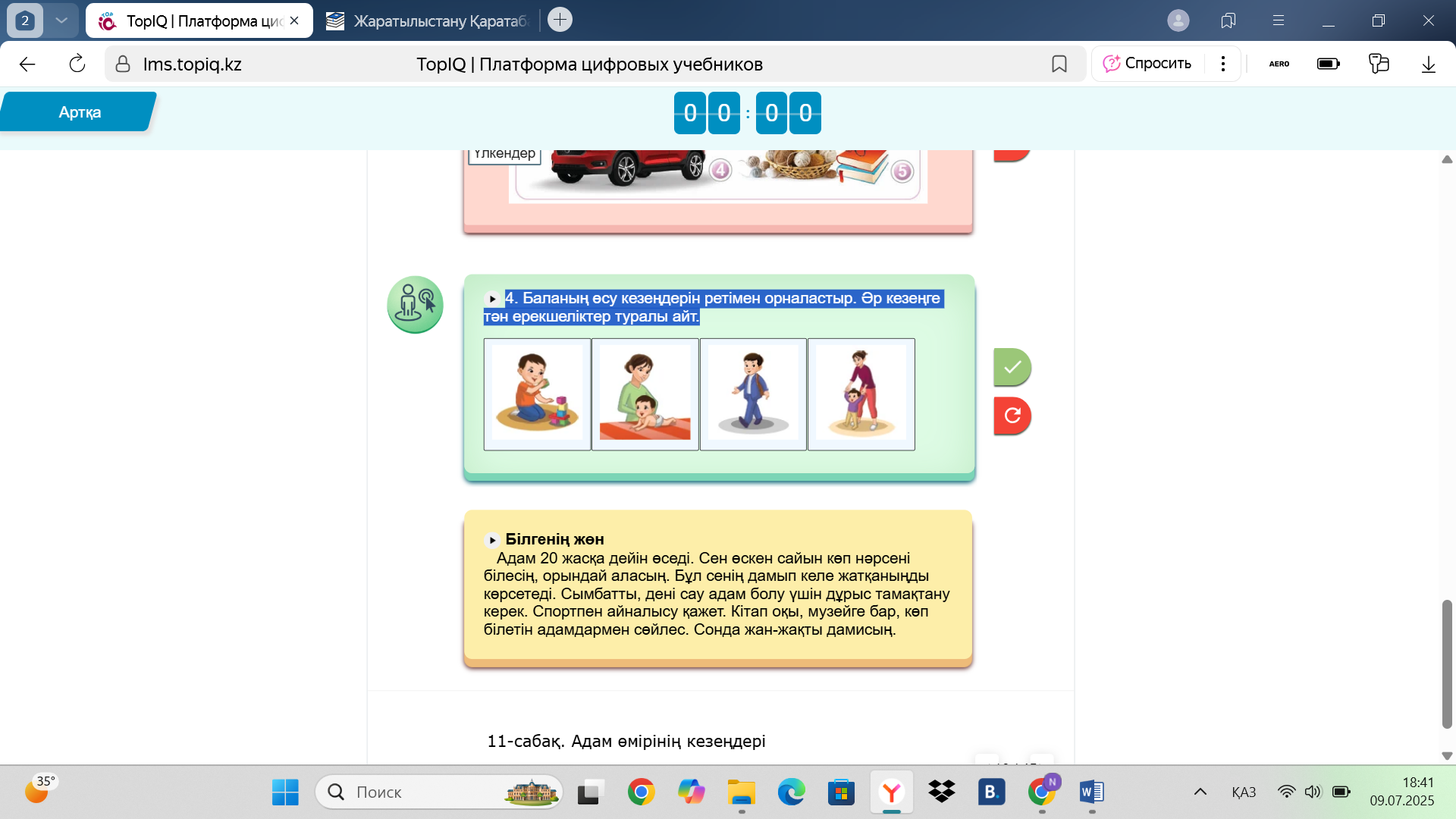 – Нәресте кезеңі. – Ерте сәбилік кезең. – Мектепке дейінгі кезең. – Оқушы кезеңі. Білгенің жөн Адам 20 жасқа дейін өседі. Сен өскен сайын көп нәрсені білесің, орындай аласың. Бұл сенің дамып келе жатқаныңды көрсетеді. Сымбатты, дені сау адам болу үшін дұрыс тамақтану керек. Спортпен айналысу қажет. Кітап оқы, музейге бар, көп білетін адамдармен сөйлес. Сонда жан-жақты дамисың. Дәптермен жұмыс 1-тапсырмада адамның өсу кезеңі бойынша қажеттілікті сәйкестендіру. 2-тапсырмада оқушыларға сурет бойынша адамның дұрыс өсіп-дамуына қажетті суреттерді белгілетеді. сәби – сылдырмақ; қарттық шақ – көзілдірік; балалық шақ – футбол; жастық шақ – рюкзак. |