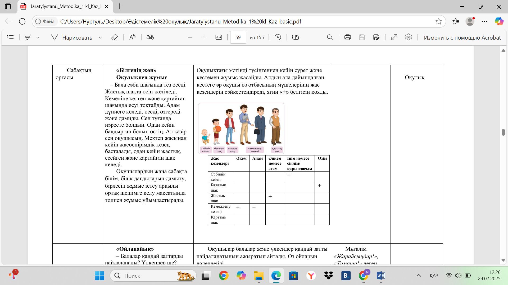 Оқушылар бір сағат бұрын болған оқиғаны, бір жыл бұрынғы, үш жыл бұрынғы оқиғаны еске түсіріп айтады. Оқулықтағы мәтінді түсінгеннен кейін сурет және кестемен жұмыс жасайды. Алдын ала дайындалған кестеге әр оқушы өз отбасының мүшелерінің жас кезеңдерін сәйкестендіреді, яғни «+» белгісін қояды. Оқушылар балалар және үлкендер қандай затты пайдаланатынын ажыратып айтады. Өз ойларын дәлелдейді. Оқушылар балалық шақ кезеңдерін мұғалімнің көмегімен айтады. Әр кезеңге тән ерекшеліктер туралы айтады. Оқушылар өз жұптарымен бойларын салыстырады. Адамның өсу кезеңіндегі қажеттілікті сәйкестендіреді. Суретке қарап, адамның дұрыс өсіп дамуына қажетті суреттерді белгілейді. |