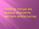 Электр тогын жақсы , Өткізгіштерге жататын материалдар: 1.Металдар – күміс, мыс, алюминий, алтын, темір және басқалары. 2.Электролит ерітінділері – тұз, қышқыл және сілті ерітінділері. 3.Плазма – иондалған газ. 4.Графит – көміртектің электр өткізгіш түрі. Топтық жұмыс «Сиқырлы сандық» әдісі 1Электр тогымен жұмыс істегенде қандай материалдарды қолдануға болады? 2.Электр тогы деген не? 3.Неліктен электр зарядтары тізбек бойымен қозғалады? 4. Электрик қандай киімдер таңдайды? 5. Электрик мамандығы туралы не айта аласың? 6.Қандай қауіпсіздік шараларын сақтауы тиіс? Интерактивті суреттер мен видеолар көрсету. ЕБҚ тапсырма Электрөткізгіштер мен электроқшаулағыштар туралы айту Тәжірибе Зертте 1.Екі полиэтилен пленканы аламыз, партаның үстіне (бір-біріне параллель) орналастырамыз, олардың үстінен бір рет қолымызбен сипаймыз. Пленкаларды ұшынан ұстап көтереміз, арасын алшақ ұстаймыз және жайлап жақындатамыз да, олардың арасындағы құбылысты байқаймыз. Жұптық жұмыс Электр тогын қандай денелер өткізеді? Суретте көрсетілген заттардың барлығы тогты өткізема?